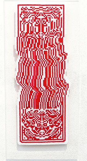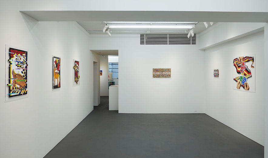 本展は、もともと麻雀荘だったこの場所から着想を得て、麻雀、トランプ、UNO、花札など、私たちに身近な“ゲーム”をテーマに制作した作品群で構成した。各作品には、バグやグリッチといった“崩壊の兆し”が描かれ、日常の中に潜むエラーや境界の揺らぎを可視化している。展示タイトル「GAME OVER」は、単なる終わりではなく、むしろ“終わりが始まりへとつながる瞬間”を示唆している。